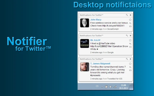 Esta herramienta te permite enterarte de tus Twits y menciones al instante, ya que cada vez que alguien que nos interese publique un Twit, nos saltara un notificación en el escritorio, pudiéndolo retwitear, contestarle o añadirlo a favoritos al instante, esto como todo tiene una pega y es que te puede ser un poco agobiante si no lo configuras, ya que te saldrá cada Ttwit que publiquen las personas que sigues en tu pantalla. Para configurarla al principio solo tenéis que darle al icono que os saldrá arriba a la derecha, darle permisos en vuestro Twitter y introducir el código que os aparecerá en la aplicación, una vez instalada, si por ejemplo solo queréis que salgan los Twits donde os mencionan, tenéis que dar click derecho, configuración y configurarlo a vuestro gusto.